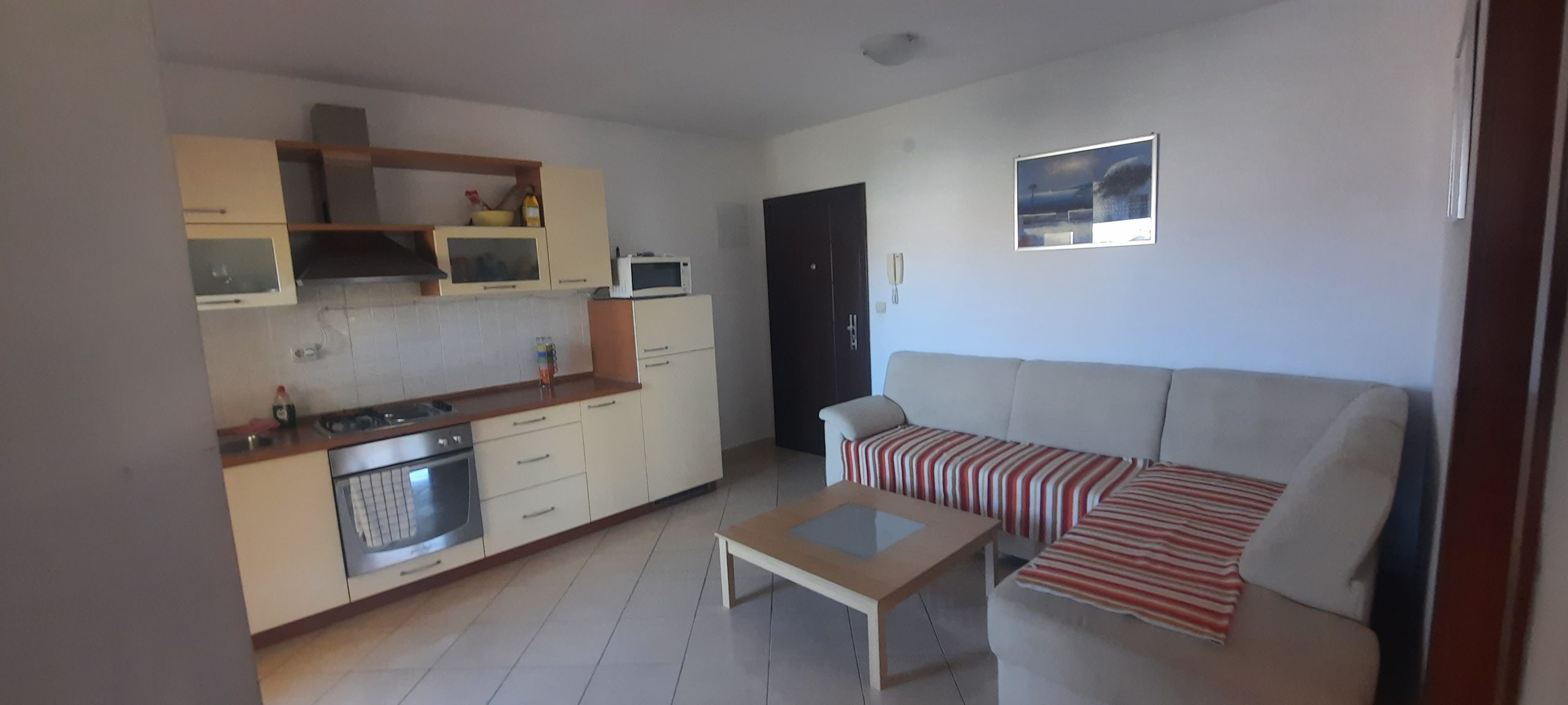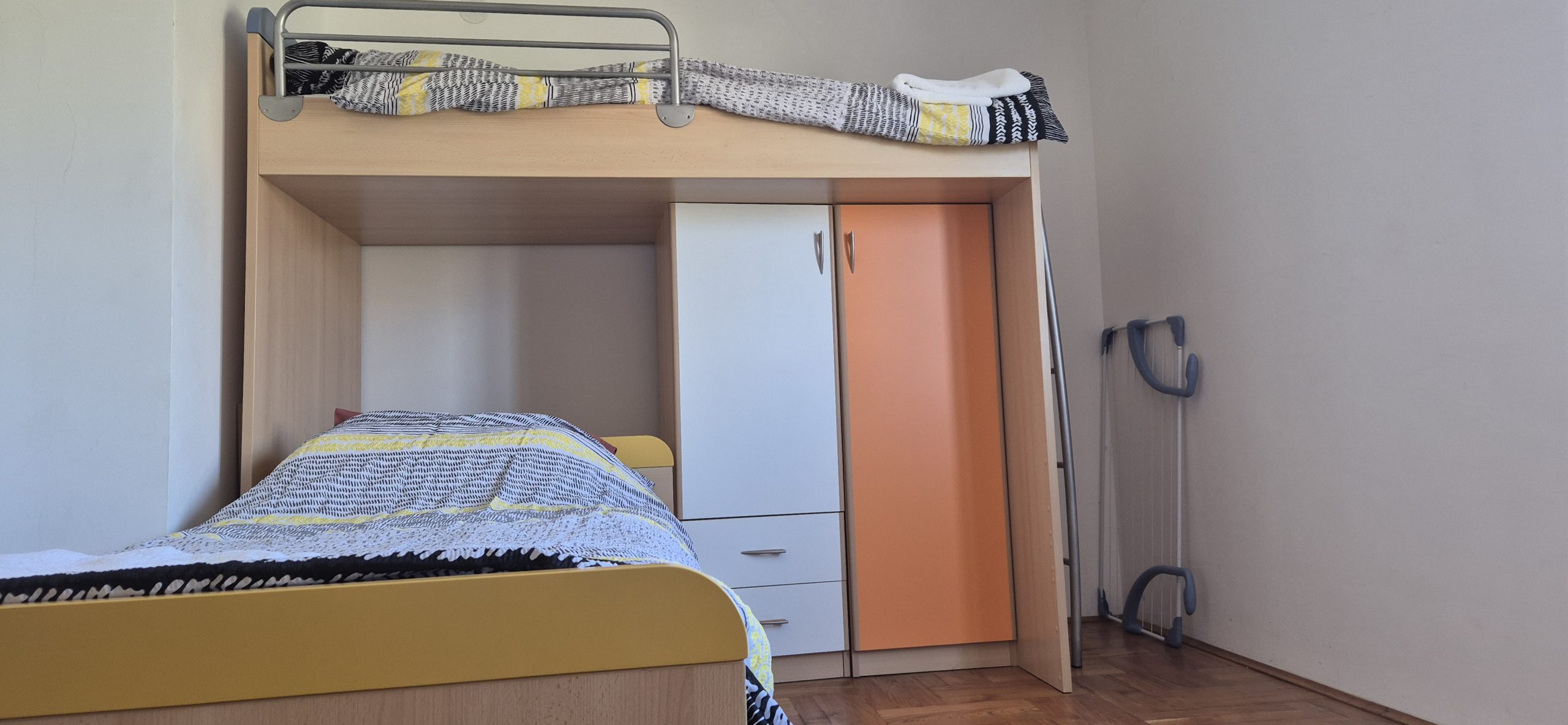 There are two bedrooms: one with a comfy king-size bed and plenty of storage, and another with a bunk bed – ideal for kids or friends. The living room also has a corner sofa that turns into a double bed, so there’s space for everyone.